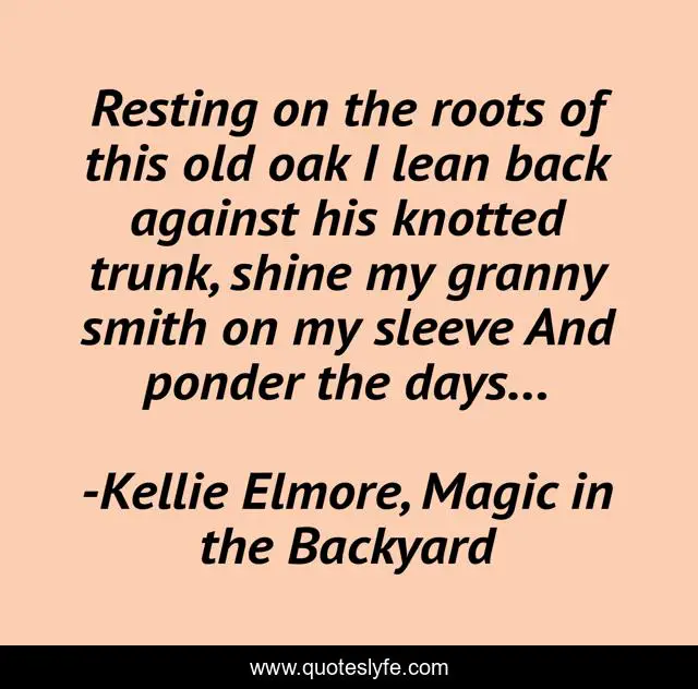 This page presents the quote "Resting on the roots of this old oak I lean back against his knotted trunk, shine my granny smith on my sleeve And ponder the days…". Author of this quote is Kellie Elmore, Magic in the Backyard. This quote is about cute, life, magic, memories, childhood, youth, imagination, coming-of-age, growing-up,.