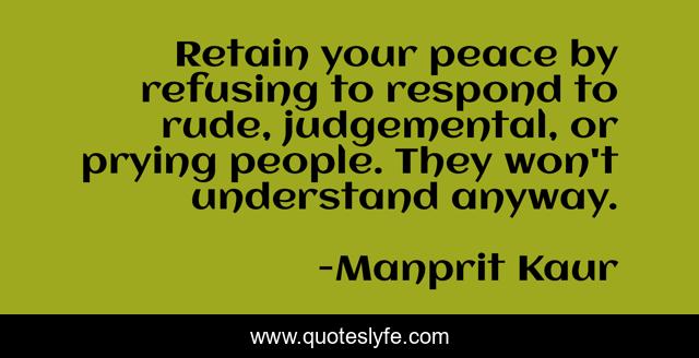 This page presents the quote "Retain your peace by refusing to respond to rude, judgemental, or prying people. They won't understand anyway.". Author of this quote is Manprit Kaur. This quote is about relationships, refuse, rude, people, peace, understand, judgemental,.