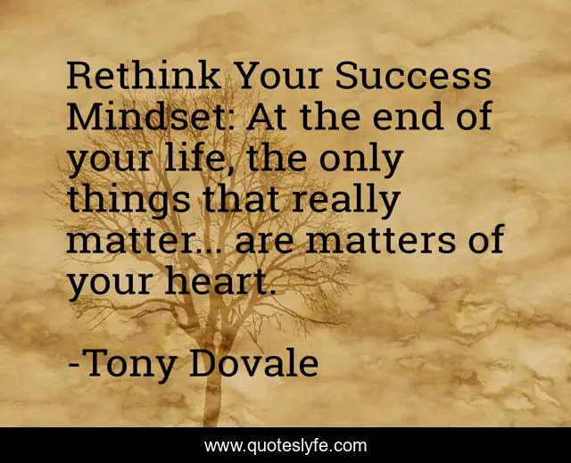 This page presents the quote "Rethink Your Success Mindset: At the end of your life, the only things that really matter... are matters of your heart.". Author of this quote is Tony Dovale. This quote is about spiritual-growth, knowledge-management, self-mastery, leadership-development, team-building, tony-dovale, learning, mndset,.
