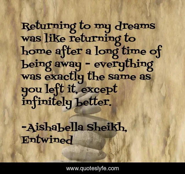 This page presents the quote "Returning to my dreams was like returning to home after a long time of being away - everything was exactly the same as you left it, except infinitely better.". Author of this quote is Aishabella Sheikh, Entwined. This quote is about returning-home, dreams,.