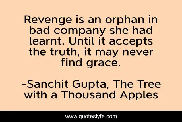 This page presents the quote "Revenge is an orphan in bad company she had learnt. Until it accepts the truth, it may never find grace.". Author of this quote is Sanchit Gupta, The Tree with a Thousand Apples. This quote is about grief, revenge,.