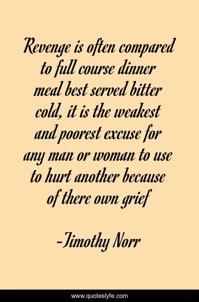 This page presents the quote "Revenge is often compared to full course dinner meal best served bitter cold, it is the weakest and poorest excuse for any man or woman to use to hurt another because of there own grief". Author of this quote is Timothy Norr. This quote is about anger, grief, hatred, revenge, depression,.