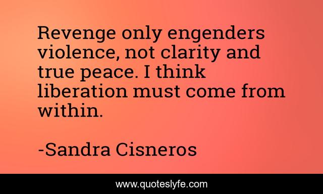 This page presents the quote "Revenge only engenders violence, not clarity and true peace. I think liberation must come from within.". Author of this quote is Sandra Cisneros. This quote is about violence, revenge, think,.