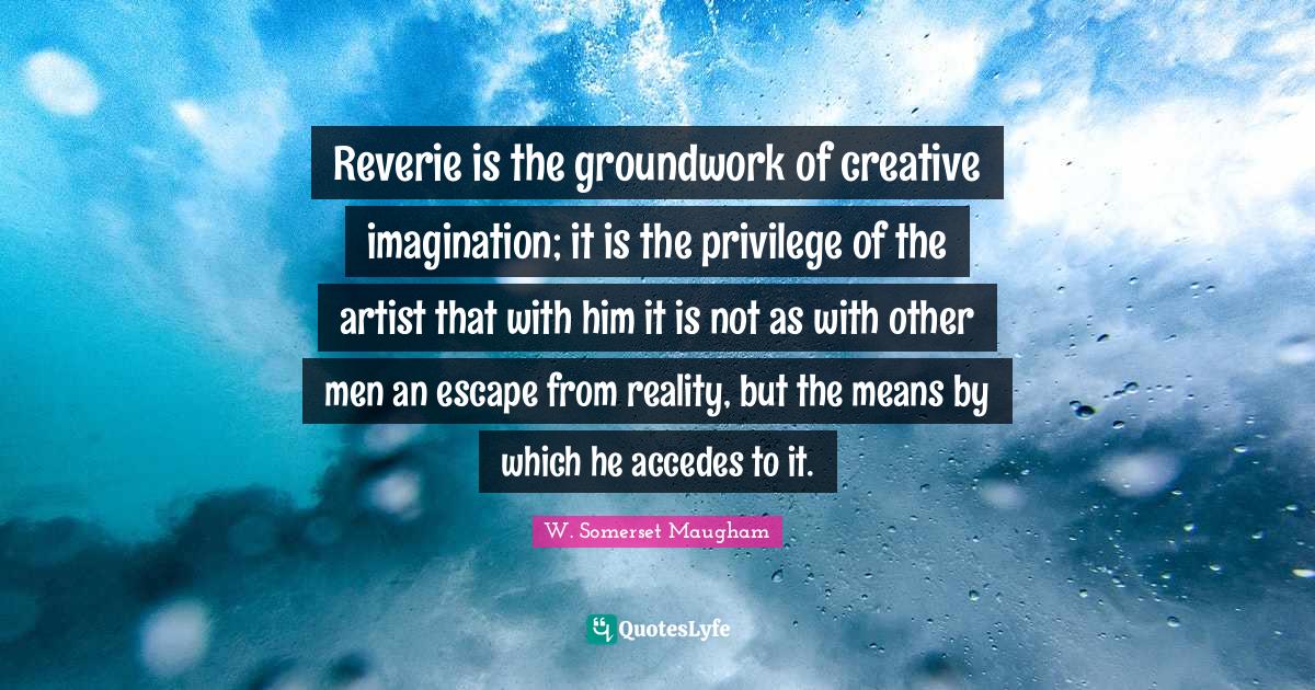 This page presents the quote "Reverie is the groundwork of creative imagination; it is the privilege of the artist that with him it is not as with other men an escape from reality, but the means by which he accedes to it.". Author of this quote is W. Somerset Maugham. This quote is about creative, reality, men, groundwork, reverie, imagination, mean, artist, privilege,.
