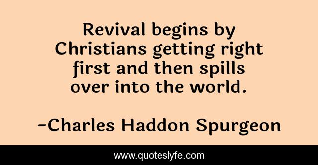 This page presents the quote "Revival begins by Christians getting right first and then spills over into the world.". Author of this quote is Charles Haddon Spurgeon. This quote is about enthusiasm, inspirational, prayer,.