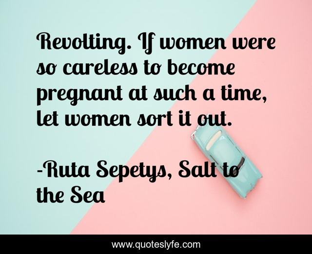This page presents the quote "Revolting. If women were so careless to become pregnant at such a time, let women sort it out.". Author of this quote is Ruta Sepetys, Salt to the Sea. This quote is about salt-to-the-sea, alfred, women-s-rights, ruta-sepetys, disgust, pregnancy, war, revulsion,.
