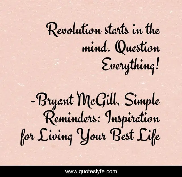 "Bryant McGill, Simple Reminders: Inspiration for Living Your Best Life Quotes." Quoteslyfe.com, 2025. Fri. 05 Dec. 2025. <https://www.quoteslyfe.com/quote/Revolution-starts-in-the-mind-Question-Everything-207012>.