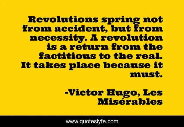 This page presents the quote "Revolutions spring not from accident, but from necessity. A revolution is a return from the factitious to the real. It takes place because it must.". Author of this quote is Victor Hugo, Les Misérables. .