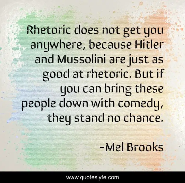 This page presents the quote "Rhetoric does not get you anywhere, because Hitler and Mussolini are just as good at rhetoric. But if you can bring these people down with comedy, they stand no chance.". Author of this quote is Mel Brooks. This quote is about rhetoric, good, people,.