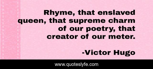 This page presents the quote "Rhyme, that enslaved queen, that supreme charm of our poetry, that creator of our meter.". Author of this quote is Victor Hugo. This quote is about charm, queen, rhyme,.