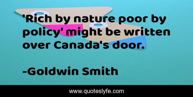 This page presents the quote "'Rich by nature poor by policy' might be written over Canada's door.". Author of this quote is Goldwin Smith. This quote is about canada, canadians,.