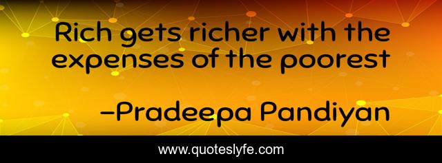 This page presents the quote "Rich gets richer with the expenses of the poorest". Author of this quote is Pradeepa Pandiyan. This quote is about poor, life, life-experience, life-lessons, money, poorest, curel, expenses, poverty,.