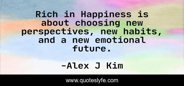 This page presents the quote "Rich in Happiness is about choosing new perspectives, new habits, and a new emotional future.". Author of this quote is Alex J Kim. This quote is about life, humor, live, happiness, self-help,.