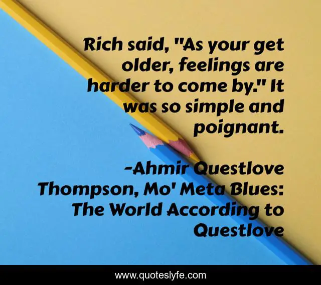 This page presents the quote "Rich said, "As your get older, feelings are harder to come by." It was so simple and poignant.". Author of this quote is Ahmir Questlove Thompson, Mo' Meta Blues: The World According to Questlove. This quote is about aging, life, feelings,.