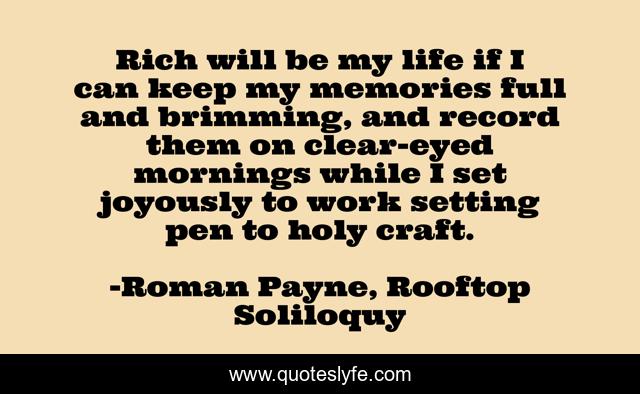 This page presents the quote "Rich will be my life if I can keep my memories full and brimming, and record them on clear-eyed mornings while I set joyously to work setting pen to holy craft.". Author of this quote is Roman Payne, Rooftop Soliloquy. This quote is about novel-writing, life, success, memories, craft, work, rooftop-soliloquy, writing, payne,.