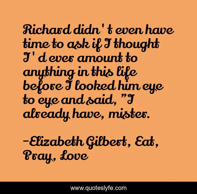This page presents the quote "Richard didn't even have time to ask if I thought I'd ever amount to anything in this life before I looked him eye to eye and said, "I already have, mister.". Author of this quote is Elizabeth Gilbert, Eat, Pray, Love. .