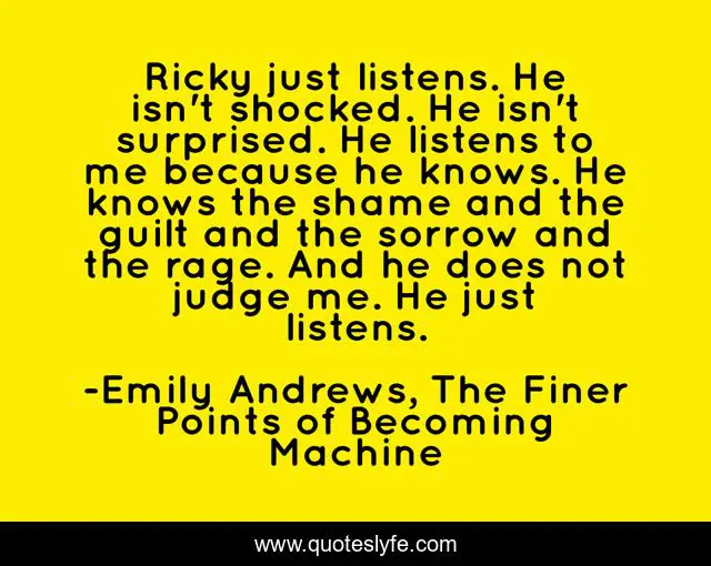 This page presents the quote "Ricky just listens. He isn't shocked. He isn't surprised. He listens to me because he knows. He knows the shame and the guilt and the sorrow and the rage. And he does not judge me. He just listens.". Author of this quote is Emily Andrews, The Finer Points of Becoming Machine. This quote is about child-abuse, rage, sorrow, shock, judgement, shame, sadness, listening, judging,.