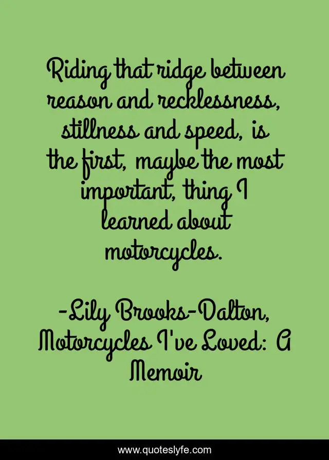 This page presents the quote "Riding that ridge between reason and recklessness, stillness and speed, is the first, maybe the most important, thing I learned about motorcycles.". Author of this quote is Lily Brooks-Dalton, Motorcycles I've Loved: A Memoir. This quote is about motorcycles, stillness, recklessness, reason, learning, riding, speed,.
