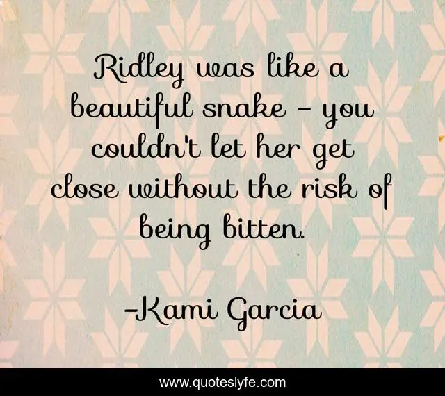 This page presents the quote "Ridley was like a beautiful snake - you couldn't let her get close without the risk of being bitten.". Author of this quote is Kami Garcia. This quote is about siren, love, beautiful-darkness, ridley, girl, affection,.