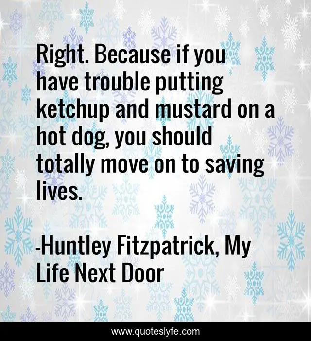 This page presents the quote "Right. Because if you have trouble putting ketchup and mustard on a hot dog, you should totally move on to saving lives.". Author of this quote is Huntley Fitzpatrick, My Life Next Door. This quote is about funny, humour, young-adult-romance, romance, comedy, young-adult,.