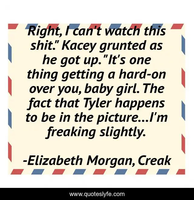 This page presents the quote "Right, I can't watch this shit." Kacey grunted as he got up. "It's one thing getting a hard-on over you, baby girl. The fact that Tyler happens to be in the picture…I'm freaking slightly.". Author of this quote is Elizabeth Morgan, Creak. This quote is about erotic, thriller-horror, contemporary, menage,.