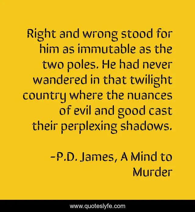 This page presents the quote "Right and wrong stood for him as immutable as the two poles. He had never wandered in that twilight country where the nuances of evil and good cast their perplexing shadows.". Author of this quote is P.D. James, A Mind to Murder. .