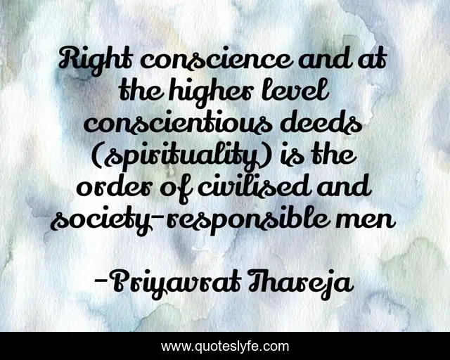 This page presents the quote "Right conscience and at the higher level conscientious deeds (spirituality) is the order of civilised and society-responsible men". Author of this quote is Priyavrat Thareja. This quote is about role-and-responsibility, human-nature, humanity, society,.