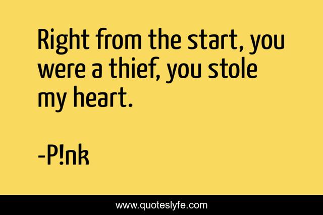 This page presents the quote "Right from the start, you were a thief, you stole my heart.". Author of this quote is P!nk. This quote is about lyrics, song,.