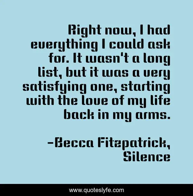This page presents the quote "Right now, I had everything I could ask for. It wasn't a long list, but it was a very satisfying one, starting with the love of my life back in my arms.". Author of this quote is Becca Fitzpatrick, Silence. This quote is about life, love, affection,.