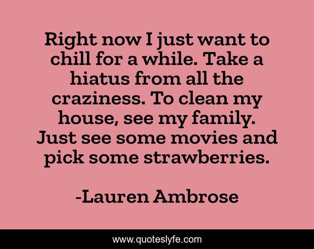 This page presents the quote "Right now I just want to chill for a while. Take a hiatus from all the craziness. To clean my house, see my family. Just see some movies and pick some strawberries.". Author of this quote is Lauren Ambrose. This quote is about movies, see,.