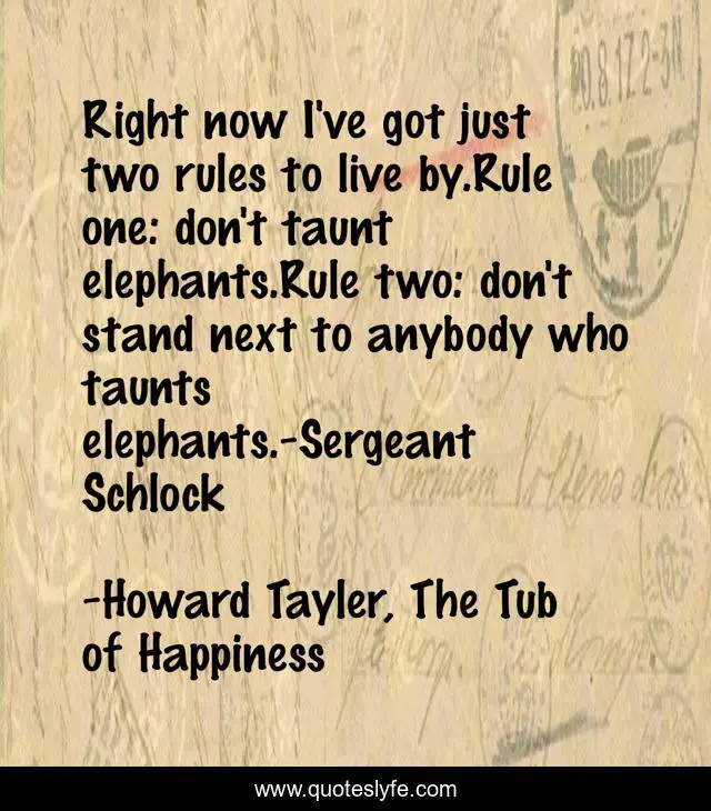 This page presents the quote "Right now I've got just two rules to live by.Rule one: don't taunt elephants.Rule two: don't stand next to anybody who taunts elephants.-Sergeant Schlock". Author of this quote is Howard Tayler, The Tub of Happiness. This quote is about rules, taunt, humour, rules-to-live-by, elephant,.