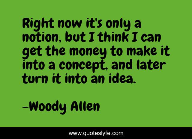 This page presents the quote "Right now it's only a notion, but I think I can get the money to make it into a concept, and later turn it into an idea.". Author of this quote is Woody Allen. This quote is about think, i can, idea,.