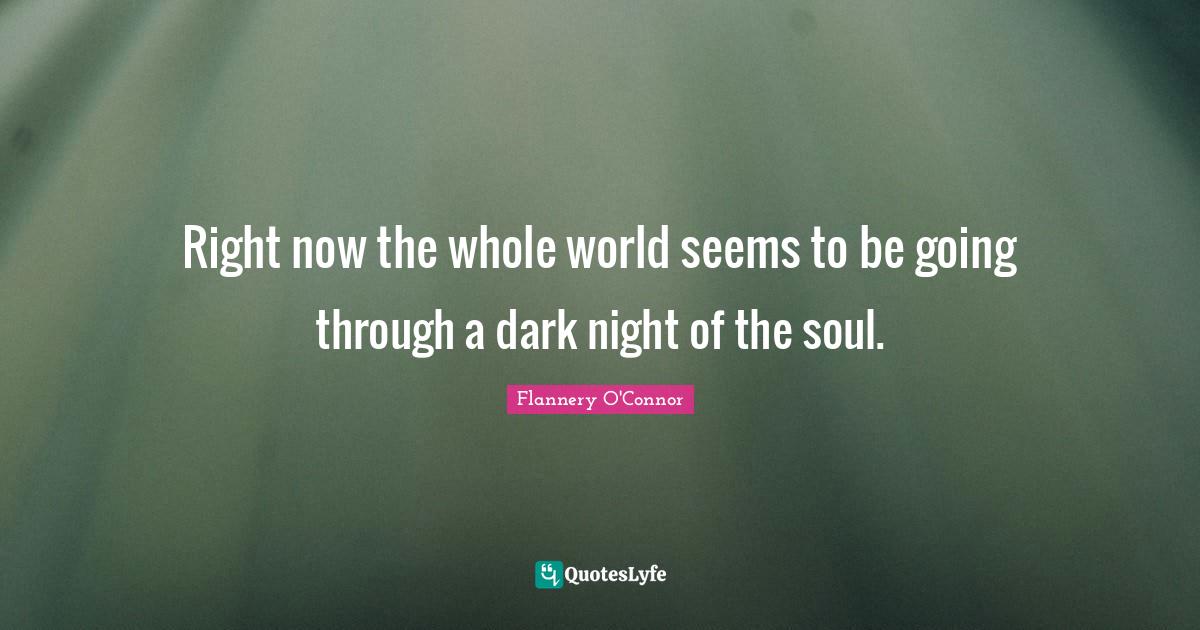 This page presents the quote "Right now the whole world seems to be going through a dark night of the soul.". Author of this quote is Flannery O'Connor. This quote is about soul, seems, dark night, whole world, right now, night, dark,.