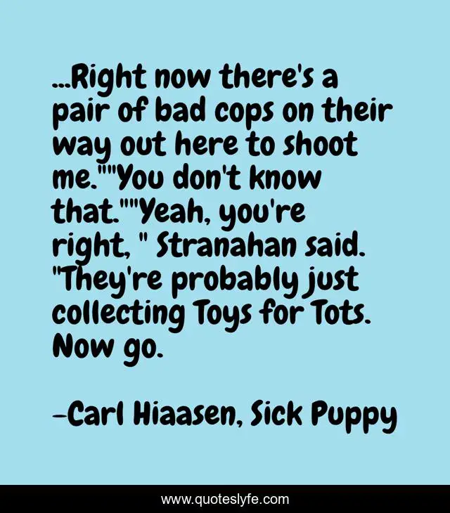 This page presents the quote "...Right now there's a pair of bad cops on their way out here to shoot me.""You don't know that.""Yeah, you're right, " Stranahan said. "They're probably just collecting Toys for Tots. Now go.". Author of this quote is Carl Hiaasen, Sick Puppy. This quote is about action, humor,.