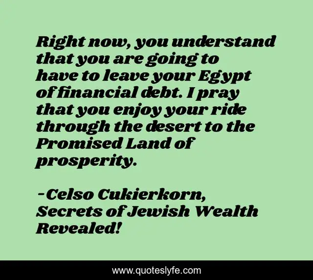 This page presents the quote "Right now, you understand that you are going to have to leave your Egypt of financial debt. I pray that you enjoy your ride through the desert to the Promised Land of prosperity.". Author of this quote is Celso Cukierkorn, Secrets of Jewish Wealth Revealed!. .