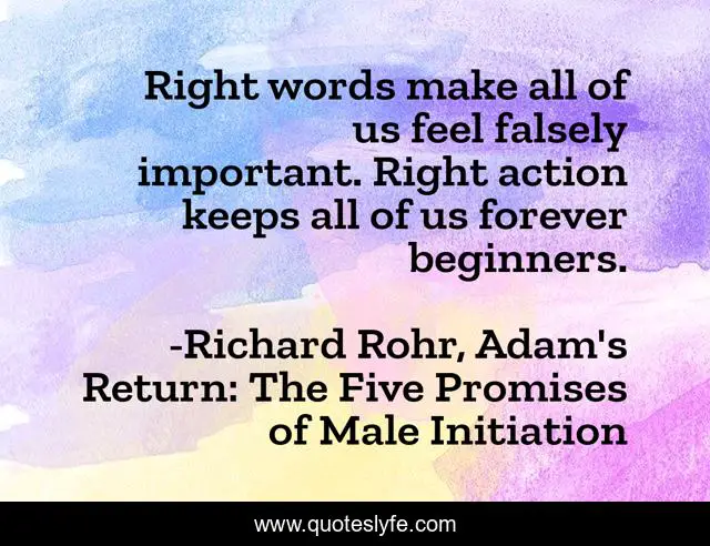 This page presents the quote "Right words make all of us feel falsely important. Right action keeps all of us forever beginners.". Author of this quote is Richard Rohr, Adam's Return: The Five Promises of Male Initiation. This quote is about confession, humility,.