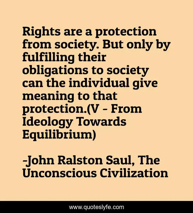 This page presents the quote "Rights are a protection from society. But only by fulfilling their obligations to society can the individual give meaning to that protection.(V - From Ideology Towards Equilibrium)". Author of this quote is John Ralston Saul, The Unconscious Civilization. .