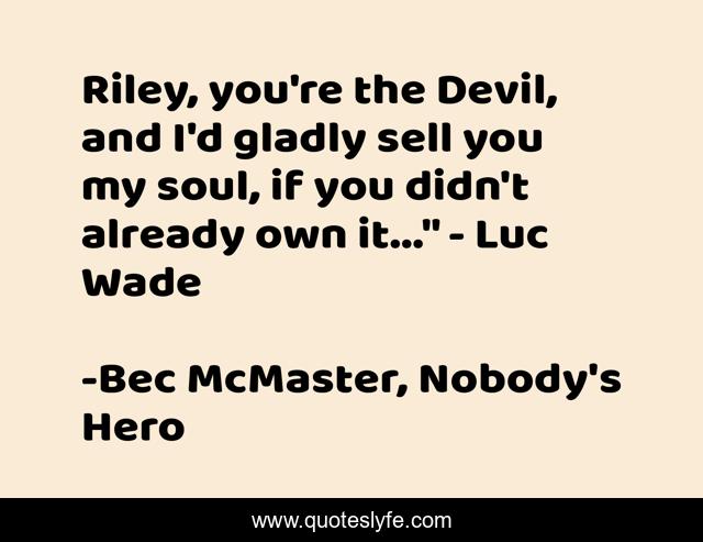 This page presents the quote "Riley, you're the Devil, and I'd gladly sell you my soul, if you didn't already own it..." - Luc Wade". Author of this quote is Bec McMaster, Nobody's Hero. This quote is about alpha-male, anti-hero, romance, shifters, paranormal,.