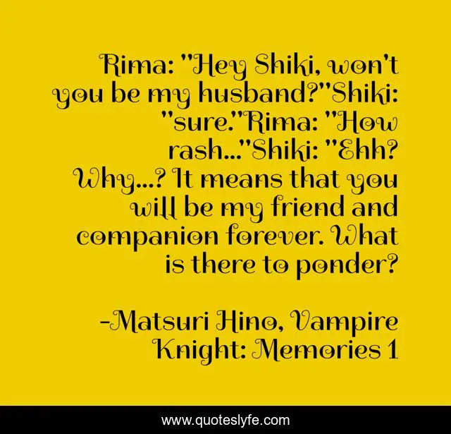 This page presents the quote "Rima: "Hey Shiki, won't you be my husband?"Shiki: "sure."Rima: "How rash..."Shiki: "Ehh? Why...? It means that you will be my friend and companion forever. What is there to ponder?". Author of this quote is Matsuri Hino, Vampire Knight: Memories 1. This quote is about love, relationship, marriage, dating, friendship, affection,.