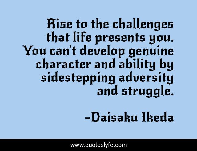 This page presents the quote "Rise to the challenges that life presents you. You can't develop genuine character and ability by sidestepping adversity and struggle.". Author of this quote is Daisaku Ikeda. This quote is about buddhism, humanism,.