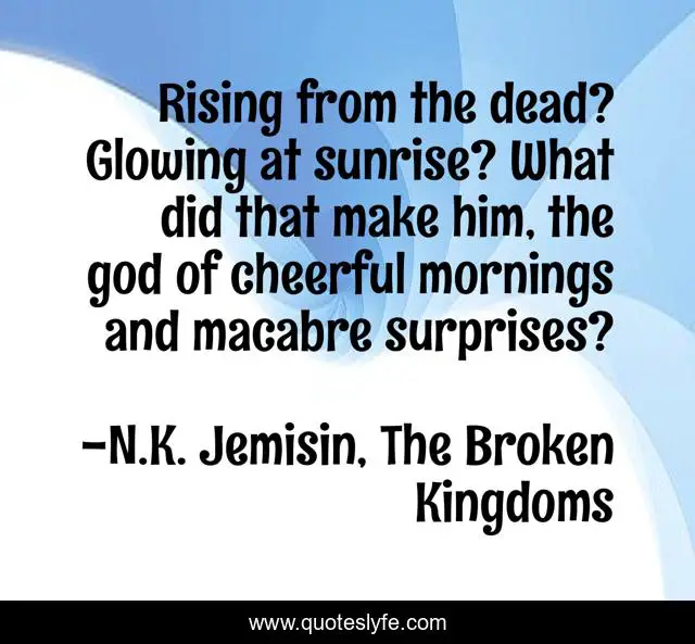 This page presents the quote "Rising from the dead? Glowing at sunrise? What did that make him, the god of cheerful mornings and macabre surprises?". Author of this quote is N.K. Jemisin, The Broken Kingdoms. .