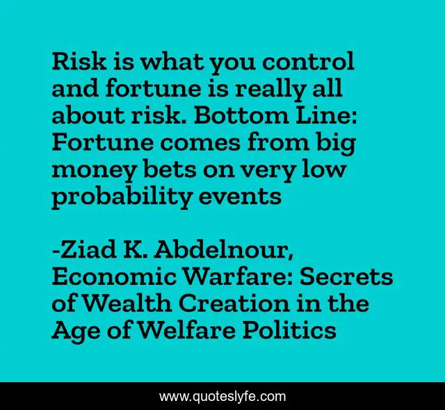 This page presents the quote "Risk is what you control and fortune is really all about risk. Bottom Line: Fortune comes from big money bets on very low probability events". Author of this quote is Ziad K. Abdelnour, Economic Warfare: Secrets of Wealth Creation in the Age of Welfare Politics. This quote is about bets, money, fortune, risk,.