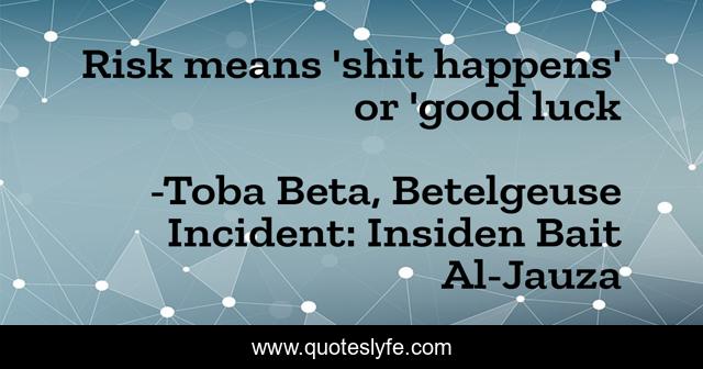 This page presents the quote "Risk means 'shit happens' or 'good luck". Author of this quote is Toba Beta, Betelgeuse Incident: Insiden Bait Al-Jauza. This quote is about luck, life, uncertainty, risk, good,.