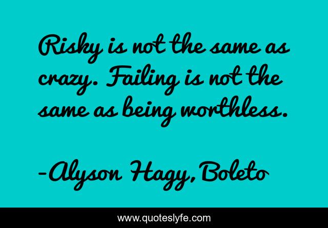 This page presents the quote "Risky is not the same as crazy. Failing is not the same as being worthless.". Author of this quote is Alyson Hagy, Boleto. This quote is about failure, risk,.