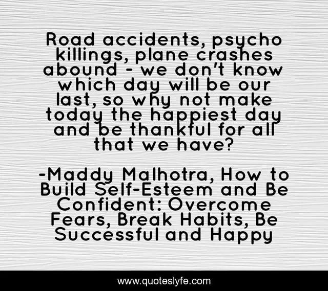 "Maddy Malhotra, How to Build Self-Esteem and Be Confident: Overcome Fears, Break Habits, Be Successful and Happy Quotes." Quoteslyfe.com, 2025. Tue. 09 Dec. 2025. <https://www.quoteslyfe.com/quote/Road-accidents-psycho-killings-plane-crashes-abound-180271>.
