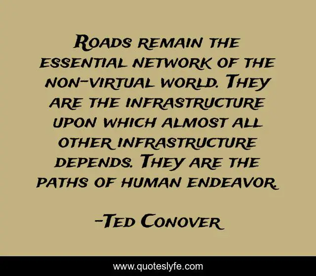 This page presents the quote "Roads remain the essential network of the non-virtual world. They are the infrastructure upon which almost all other infrastructure depends. They are the paths of human endeavor.". Author of this quote is Ted Conover. This quote is about human-civilization, travel, infrastructure, road, global-development,.