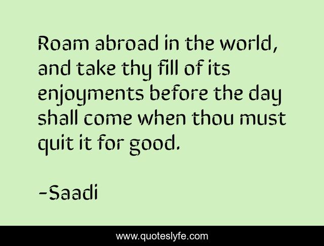 This page presents the quote "Roam abroad in the world, and take thy fill of its enjoyments before the day shall come when thou must quit it for good.". Author of this quote is Saadi. This quote is about life, travel, inspiration,.