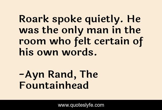 This page presents the quote "Roark spoke quietly. He was the only man in the room who felt certain of his own words.". Author of this quote is Ayn Rand, The Fountainhead. This quote is about the-fountainhead, certainty, howard-roark, words,.