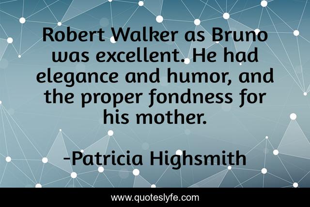 This page presents the quote "Robert Walker as Bruno was excellent. He had elegance and humor, and the proper fondness for his mother.". Author of this quote is Patricia Highsmith. This quote is about mother, elegance, excellent,.