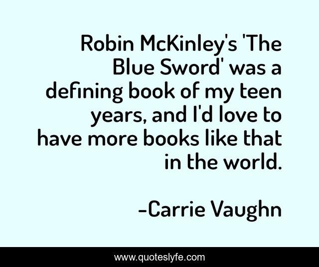 This page presents the quote "Robin McKinley's 'The Blue Sword' was a defining book of my teen years, and I'd love to have more books like that in the world.". Author of this quote is Carrie Vaughn. This quote is about blue, world, love, affection,.